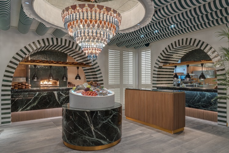 عندما يدخل الضيوف إلى المساحة الجذابة، سيحيط بهم ظلال اللون الوردي الداكن والأخضر الزمردي الدافئة للمطعم، بينما تحتل الثريات الرائعة والمصابيح المعقدة مركز الصدارة. تجلب المساحات الخضراء الوفيرة وأوراق الشجر ذات الطراز المتوسطي المكان، بينما تزين البلاط الإيطالي الزاهي الأرضيات وورق الحائط الإيطالي الجميل الذي يبطن الجدران، مما يخلق جمالية “Ciao Bella”. تضفي أسطح العمل الرخامية باللون الأخضر الزمردي والبار المذهل جمالاً لا يضاهى على المكان، بينما يضيف الجدار المزود بمرآة عمقًا وسطوعًا، كما تُعد الأريكة المخملية الوردية الأنيقة المكان الذي يلتقي فيه الأناقة بالراحة.