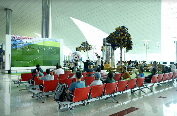 ولضمان حصول المشجعين مع نتائج المباريات أولاً بأول حتى أثناء سفرهم، قامت JCDecaux بالشراكة مع مطارات دبي، لعرض نتائج مباريات بطولة كأس العالم أولاً بأول على شاشات الإعلانات عبر المواقع الرئيسية في مطار دبي الدوليDXB. كما يمكن لعشاق كرة القدم الاستمتاع بمشاهدة المباريات مباشرة عبر شاشة العرض في منطقة المشجعين في المبنى 3.