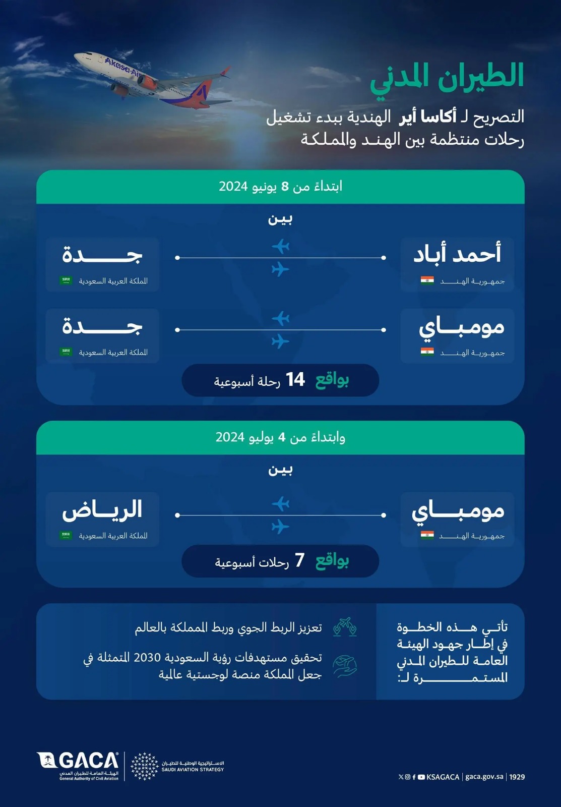 أعلنت الهيئة العامة للطيران المدني ممثلة بقطاع النقل الجوي والتعاون الدولي، التصريح بتشغيل خطوط (أكاسا اير) الجوية الهندية برحلات منتظمة تجارية للمسافرين بين جمهورية الهند والسعودية من وإلى مدن (أحمد آباد، ومومباي، والرياض، وجدة)، وذلك خلال الموسم الصيفي لعام 2024 ابتداءً من 8 يونيو الجاري، بواقع 14 رحلة إلى مطار جدة (رحلتين من مدينة أحمد آباد، و12 رحلة من مدينة مومباي) و7 رحلات إلى مطار الرياض من مدينة مومباي، ابتداءً من 4 يوليو القادم.