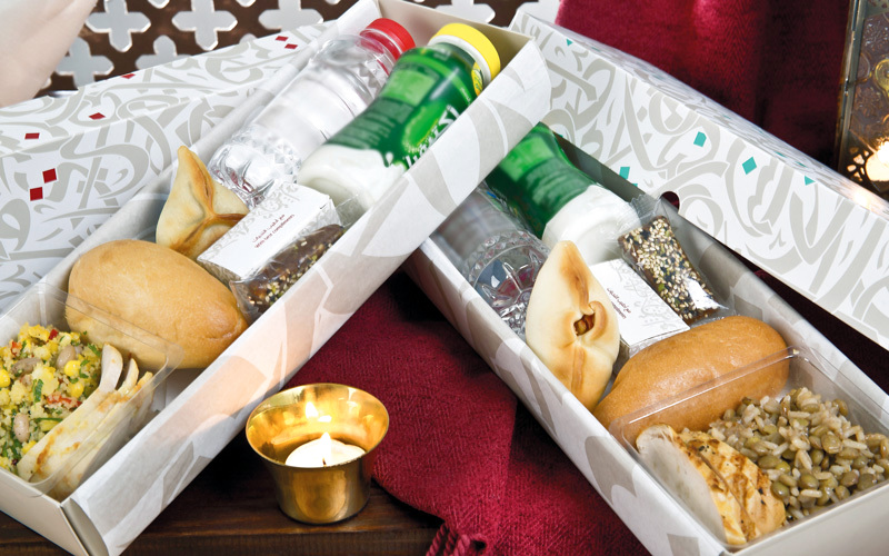 وستحتوي علب الوجبات الرمضانية على مقبلات خفيفة مثل الحمص أو المتبل مع الخبز العربي، وحلويات مثل شوكولاتة اللوز، وبقلاوة الجوز، وكرات المشمش، والتمر التقليدي، إلى جانب لفائف الدجاج بالزعتر والجبن الموزاريلا، أو لفائف لحم الشاورما مع جبن الحلوم، مع مشروب اللبن، وتقدم طيران الإمارات علب الإفطار الرمضانية إلى جانب خدمة الوجبات الساخنة المعتادة.